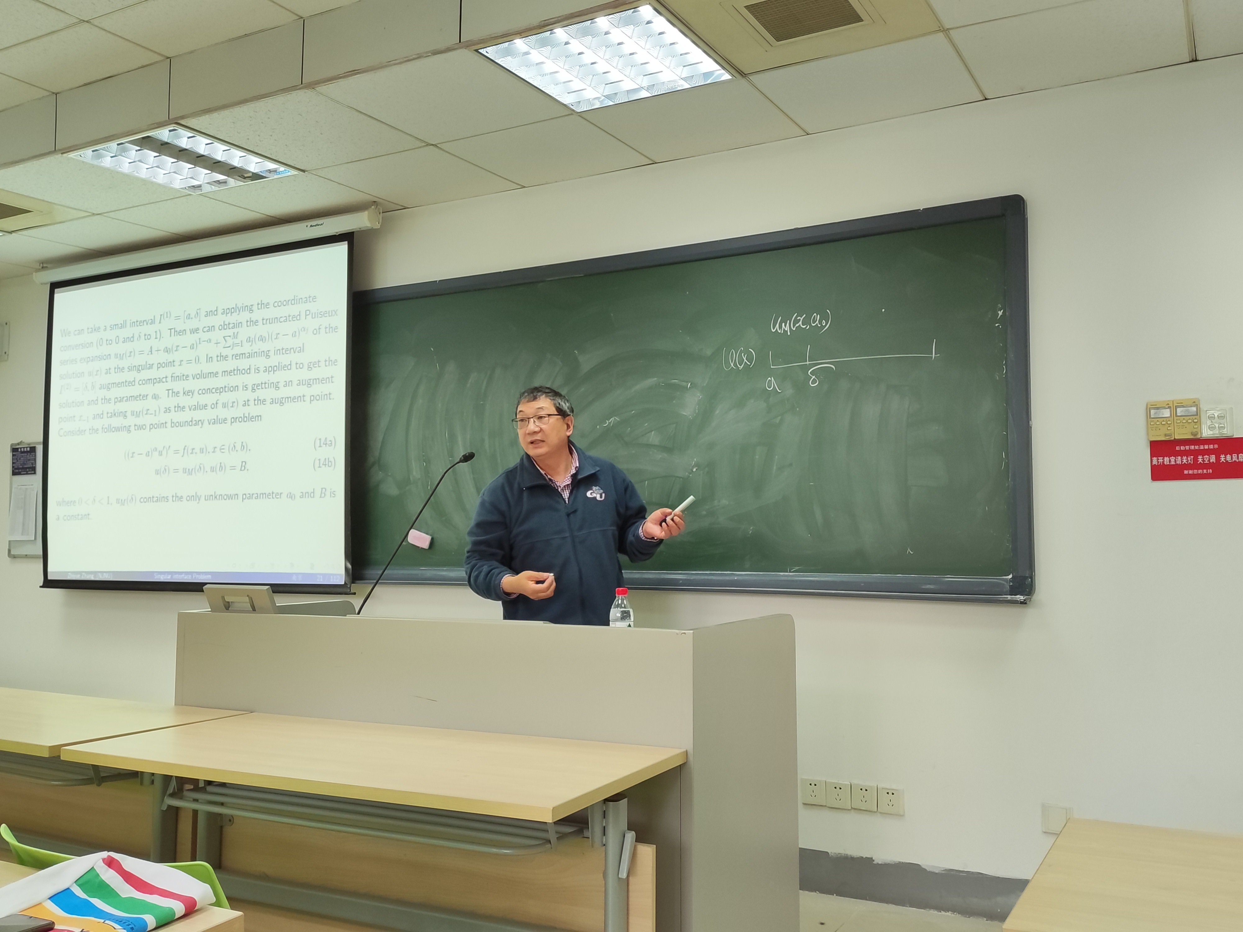 张志跃教授为大家带来了题为“非线性奇异微分方程的混合增广紧有限体积方法及其在界面和控制问题中应用”的学术报告。在报告的开头部分,张老师介绍了非线性奇异微分方程和界面问题的求解的思路,指出解的奇异性和低正则性给高精度的数值计算格式构造带来很大挑战。随后,张老师分享了他的课题组近些年的研究成果。他们基于恢复 Puiseux 级数,利用与奇性相关的增广变量,建立求解非线性奇异微分方程及界面问题的高精度格式,数值实验验证了格式的有效性。他们特别给出极端条件下界面大跳量比情形和系数blow-up 情形的高精度数值结果,以及该方法在高维问题上的探索结果。
