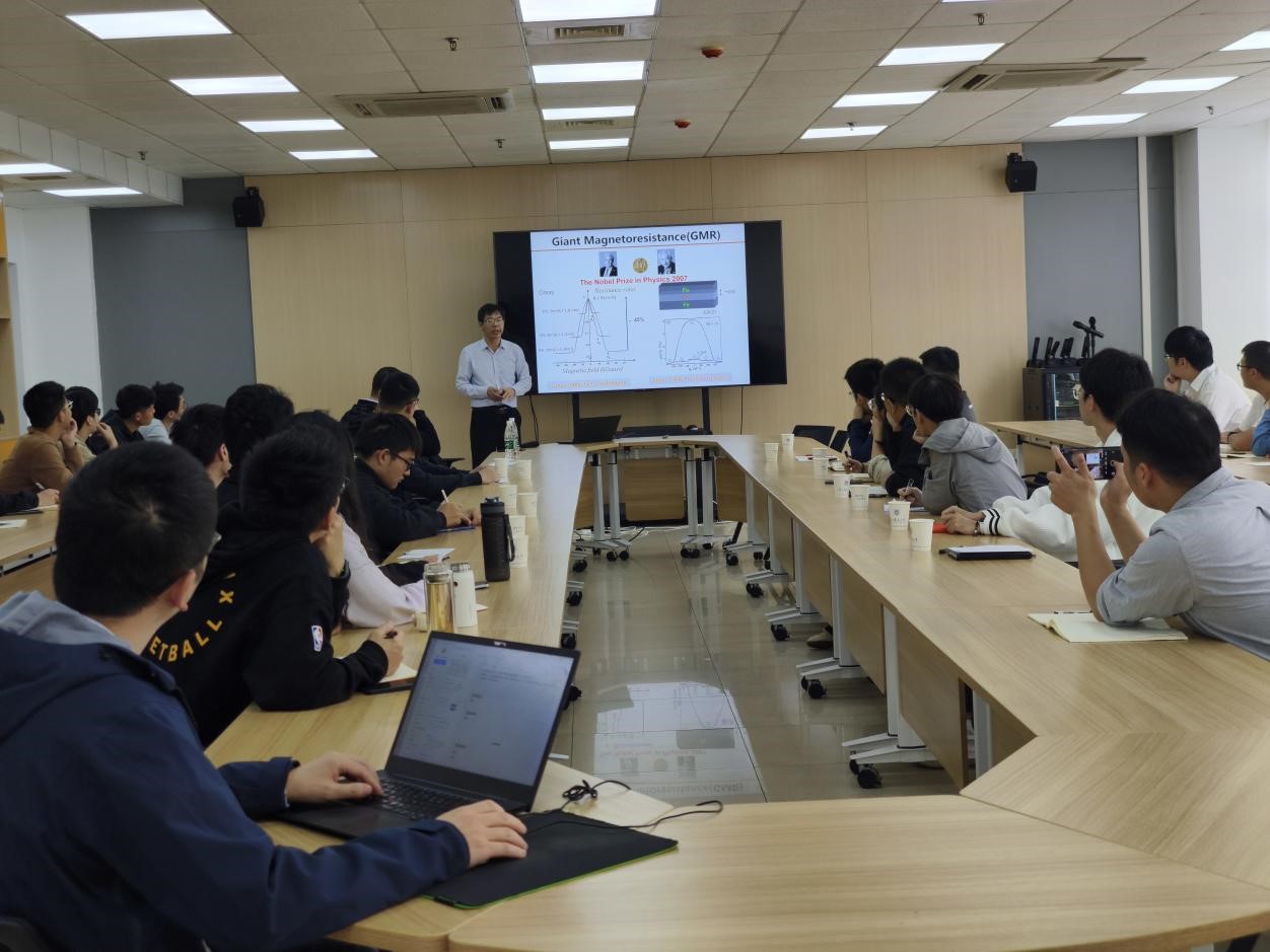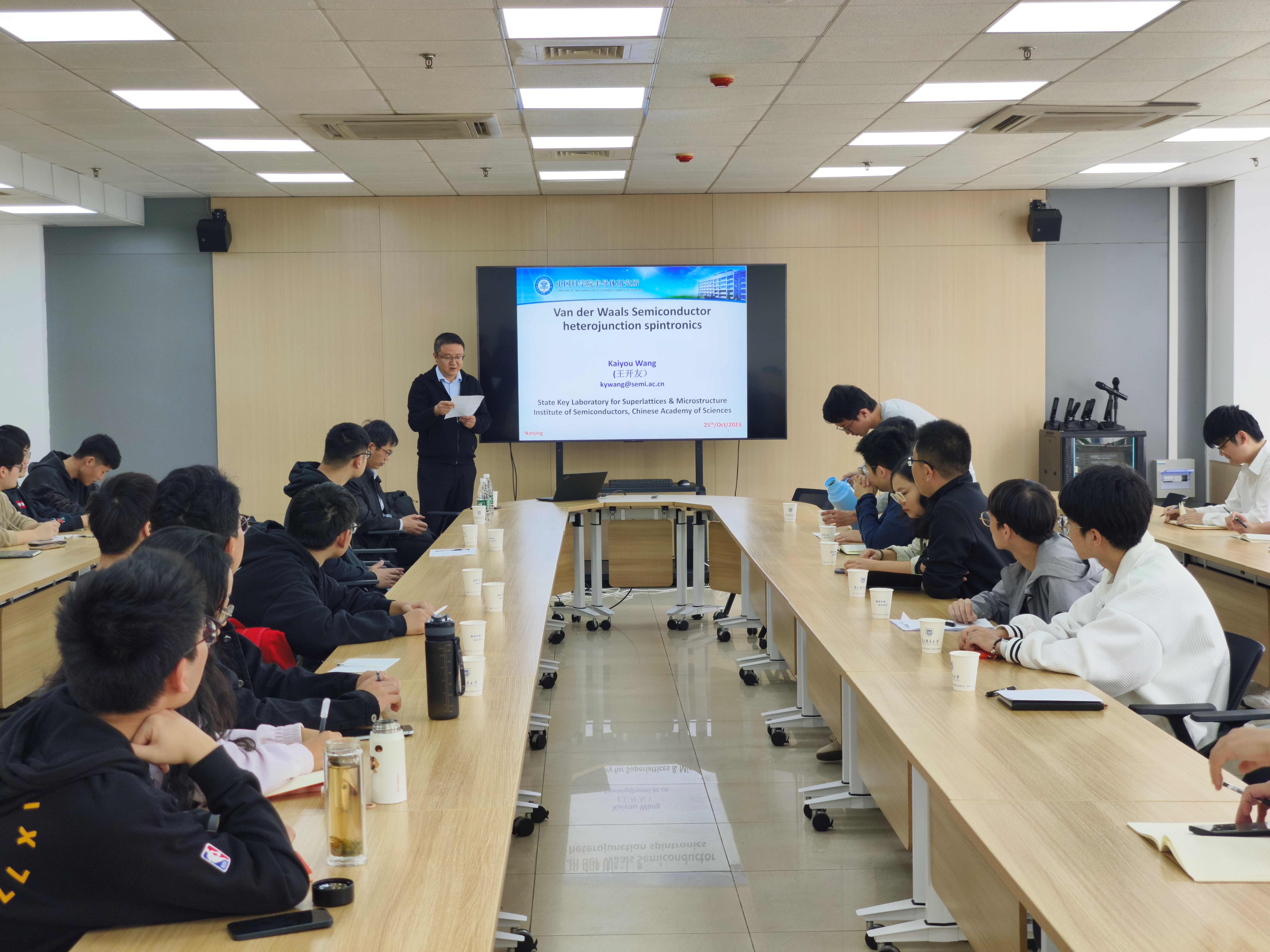王开友研究员做了题为“二维半导体自旋电子器件研究”的专题报告,介绍了二维铁磁自旋阀器件、异质结器件以及半导体自旋电子器件的相关工作成果和最新进展,指出了使用二维范德华材料在制备器件上的优势、面临的挑战、以及前景展望。与会师生踊跃提问,王老师都给予详细的解答,并就未来可能的研究方向和思路与师生进行了深入的讨论和交流。