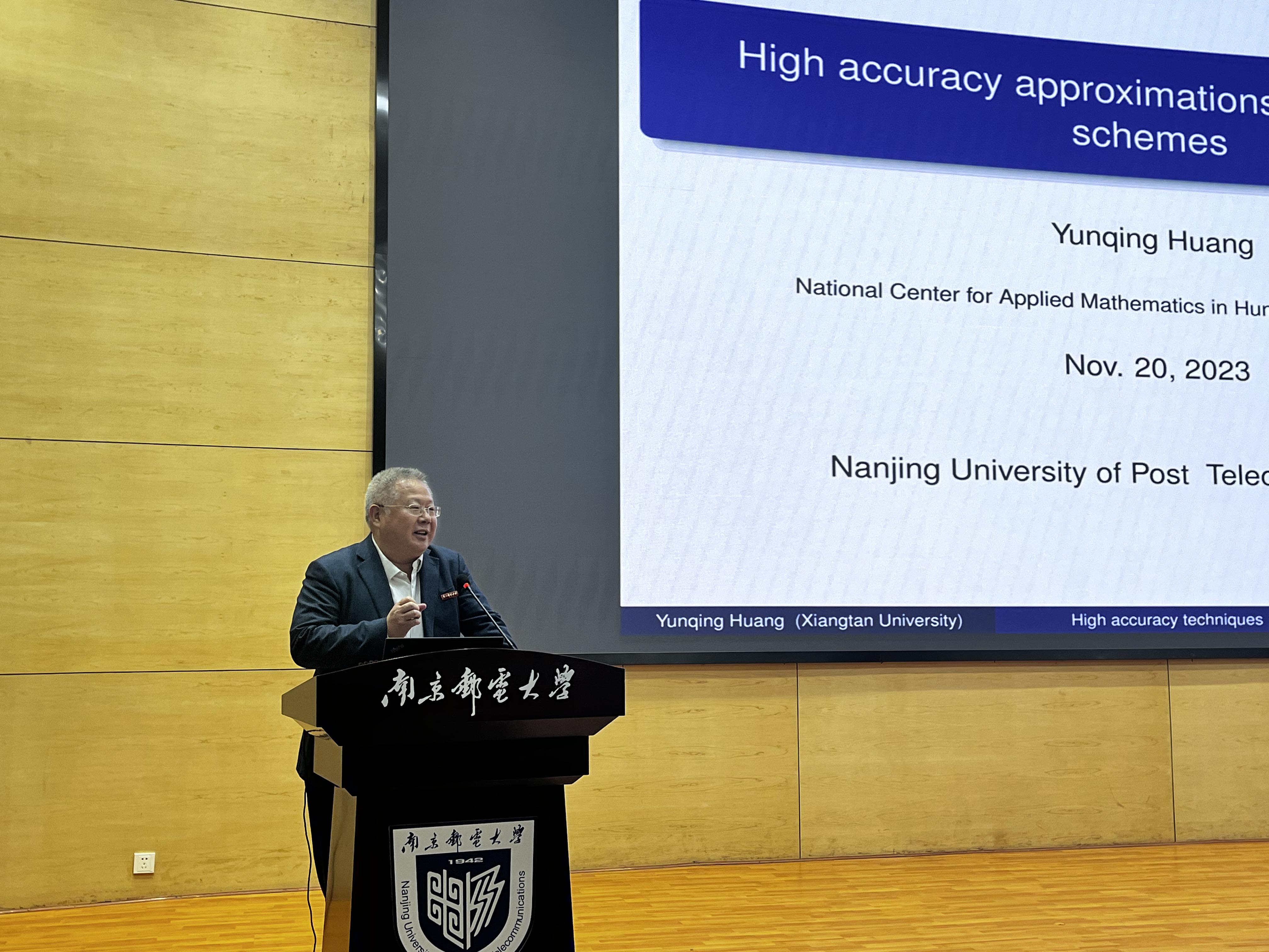 黄云清教授为大家带来了题为“High accuracy approximations from low order schemes”的学术报告。在报告中,黄教授首先讨论了数值计算方法的重要意义。他指出先进的数值计算方法可以弥补计算硬件的不足,节约计算成本,具有很高的理论和应用价值。其次,黄教授从一个大家耳熟能详的计算圆周率的问题出发,引出了数值计算方法中用于提高计算精度的组合、外推、校正等经典思想,从而使大家认识到:简单低成本的数值后处理能使一个低精度的方法变为高精度,从而大幅降低计算的时间成本。随后,在报告的主体部分,黄教授介绍了他们课题组在有限元方法方面的一系列研究进展。他们基于低阶线性有限元方法,仍然应用那些经典的组合、外推、校正等思想,利用很小的计算代价显著提高了方法的精度。虽然面对的问题要复杂很多,但经典的思想依然有效,并在一些问题上取得了令人惊讶的效果。最后,部分师生就感兴趣的问题和黄教授进行了现场讨论。