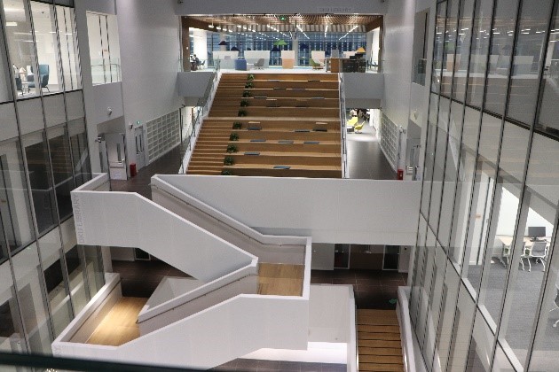 在昆山杜克大学员工志愿者的带领下,理院学子参观了昆山杜克大学的校园,走进图书馆、宿舍区、食堂、综合体育馆等学习、休闲场所,了解公司的整体环境。