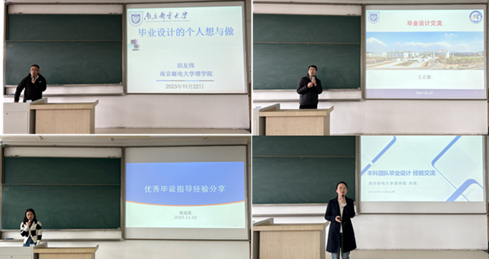 随后,优秀毕业设计指导教师田友伟副教授、王正新副教授、钱龙霞副教授和毕岚副教授分别进行了经验分享。四位老师结合自身经验从论文选题、开题前文献调研、过程把控、毕业设计各项材料的具体指导、团队毕业设计要点、优秀毕业设计特征等方面进行了深入细致地分享和交流。