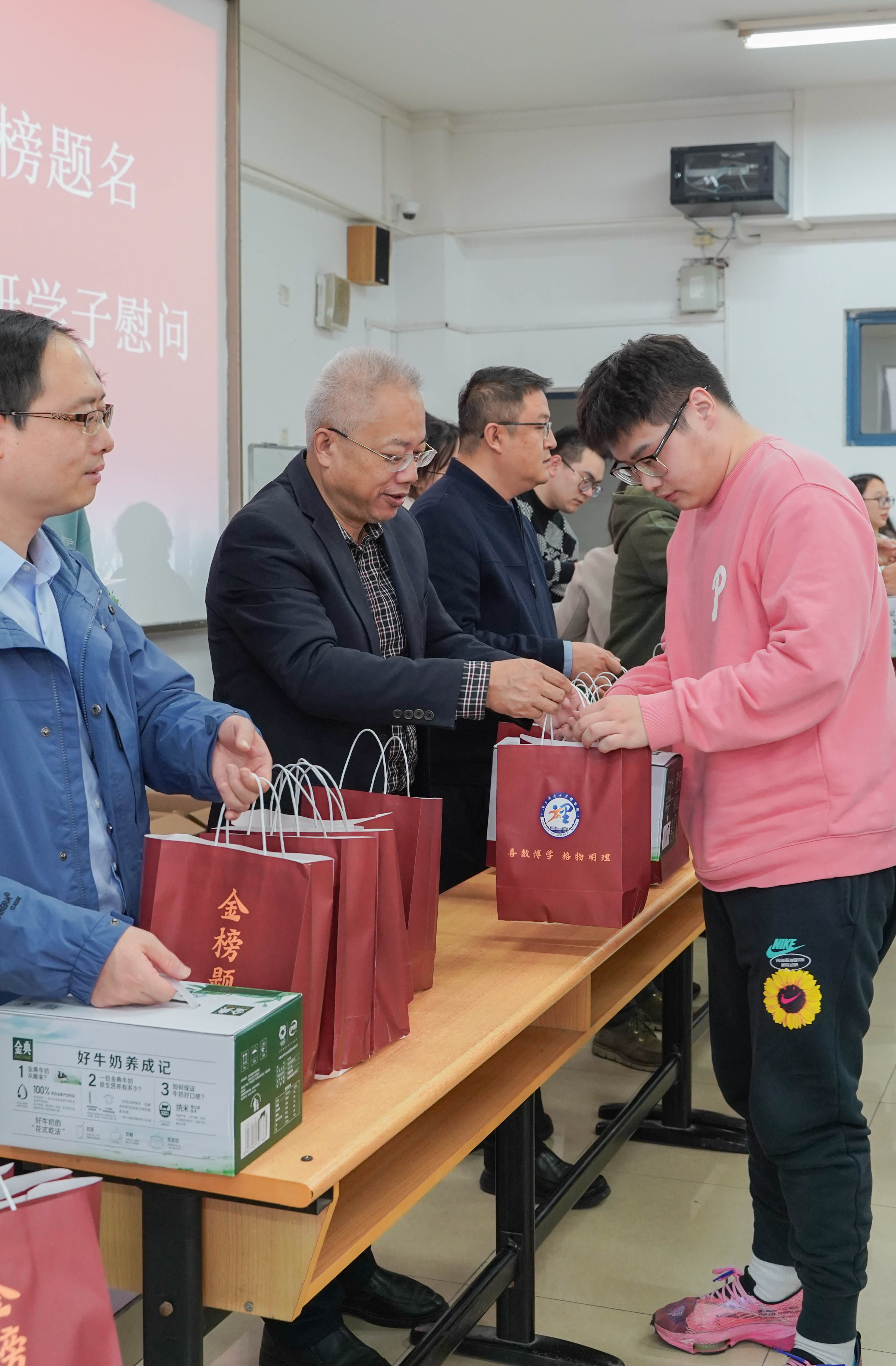 接下来,院领导们一起为考研学子们发放“金榜题名”考研大礼包,传递冬日温暖!礼包中的脐橙意为“脐”开得胜、心想事“橙”,牛奶寓意“身体倍棒、牛气冲天”,暖贴代表“驱散寒冷,暖意融融”,文具袋则象征“妙笔生花、金榜题名”。