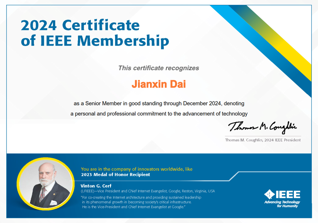 12月3日,据国际电气和电子工程师协会(IEEE,The Institute of Electrical and Electronics Engineers)官方通知,经过专家推荐和遴选委员会的严格评审,戴建新副教授当选为IEEE高级会员(IEEE Senior Member)。IEEE协会充分肯定其在信息科学领域所取得的成果,并对其在相关领域较深厚的知识储备、扎实的科研能力以及刻苦钻研的精神表示高度认可。