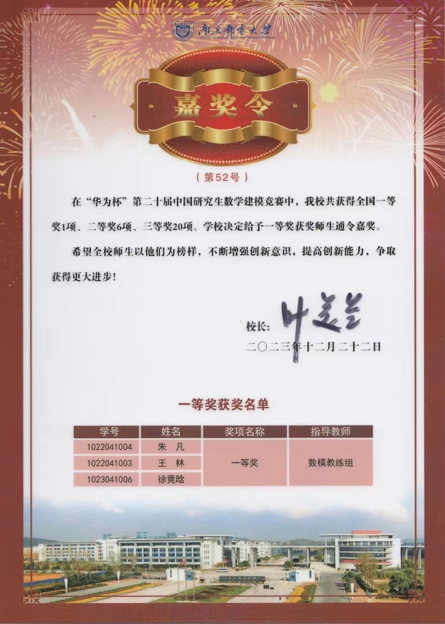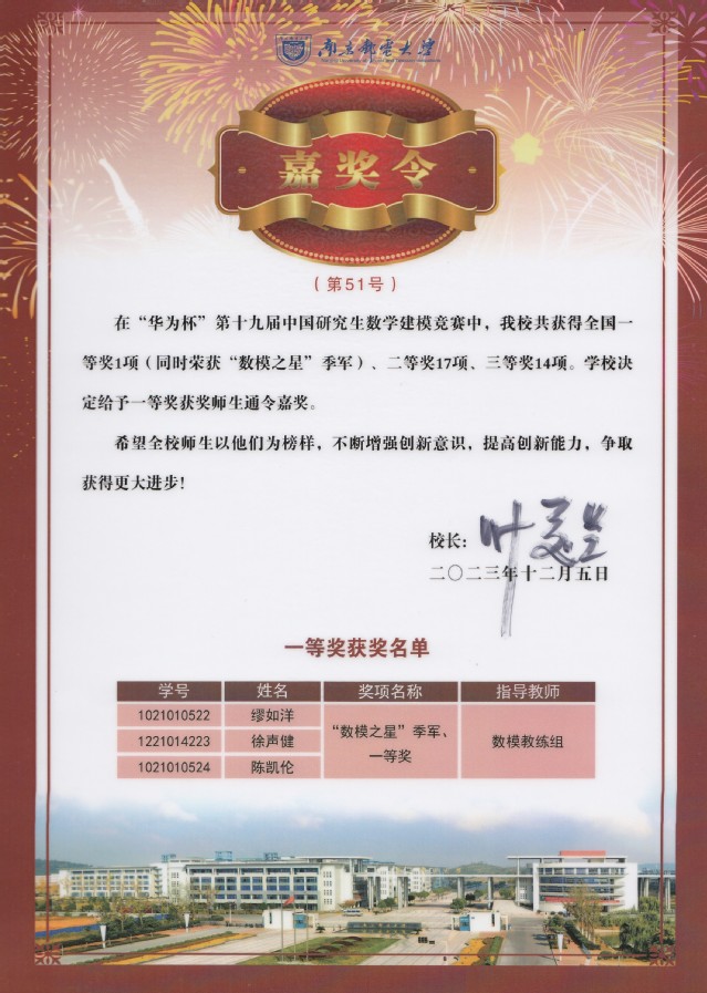 近日,董事长叶美兰签发嘉奖令表彰公司中国研究生数学建模竞赛“数模之星”及一等奖的获奖师生,其中研究生团队缪如洋、徐声健、陈凯伦在第十九届中国研究生数学建模竞赛中获得全国一等奖,同时兼获“数模之星”季军,研究生团队朱凡、王林、徐竟晗在第二十届中国研究生数学建模竞赛中获得全国一等奖。