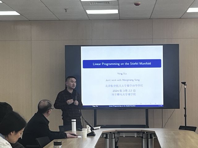 夏勇教授做了题为“Linear Programming on the Stiefel Manifold”的精彩报告,研究提出了一个新的优化模型(LPS),并展示了其在多个领域的应用。通过Shapiro-Barvinok-Pataki定理,夏勇教授提出在一定条件下,LPS有一个精确的SDP松弛。此外,夏勇教授还提出了在满足LICQ条件时,标准一阶和二阶的必要最优性条件足以保证全局最优性的结论。这项研究为Stiefel流形上的优化问题提供了新的视角和解决方案。