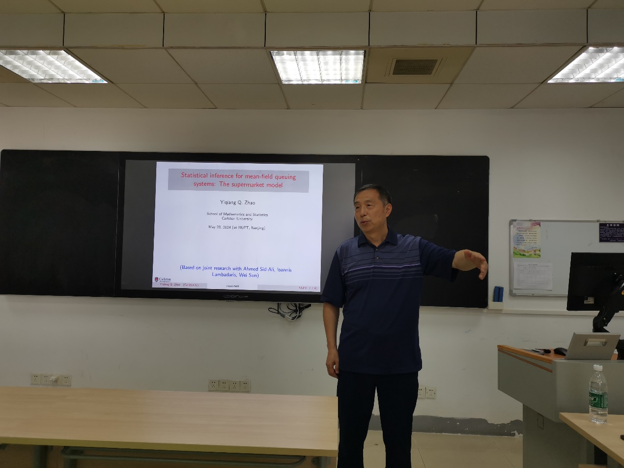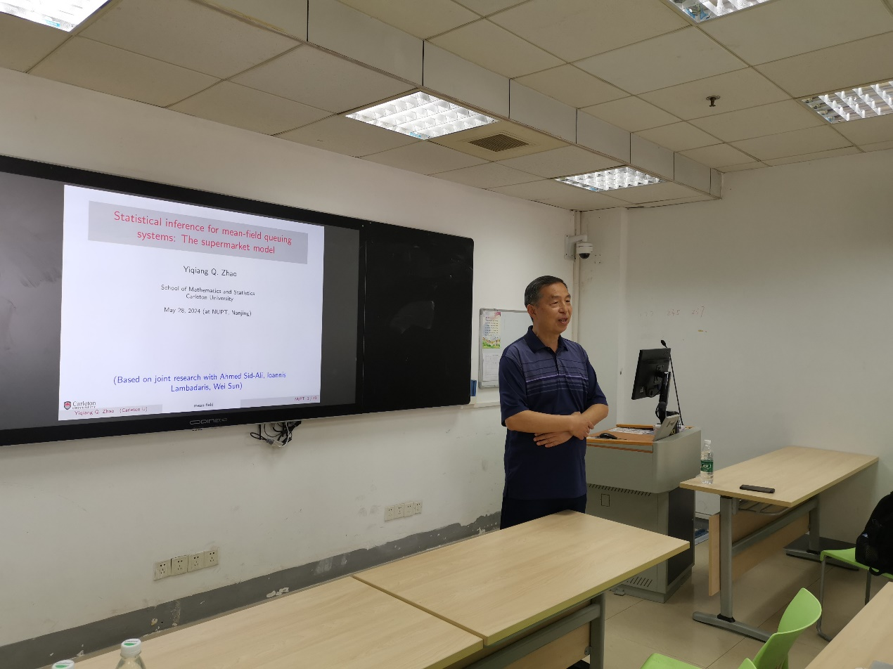 赵以强教授为大家带来了题为“Statistical inference for mean-field supermarket queueing models”的学术报告。赵教授首先回顾了平均场模型的研究背景,并介绍了在平均场模型中进行统计推断研究的研究动机及近年来的研究现状。赵教授对经典的supermarket queueing models中的到达率和服务率进行统计推断,并报告了估计值一致性和渐近正态性的证明思路及简要过程。