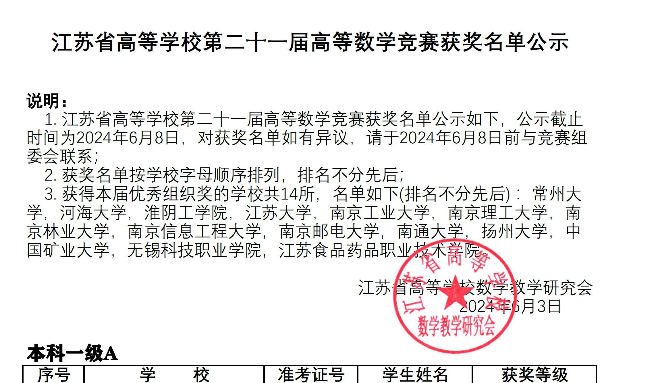 近日,2024年江苏省高等公司第二十一届高等数学竞赛结果揭晓,公司学子取得优异成绩。在本科一级A级别比赛中,共有261人获奖,其中39人获得一等奖、71人获得二等奖、151人获得三等奖,本科一级B级别比赛中,共有37人获奖,其中17人获得一等奖、14人获得二等奖、6人获得三等奖,其中一等奖获奖数及获奖总人数均位在全省参赛高校中位列前茅。此外公司还荣获江苏省高等公司高等数学竞赛优秀组织奖。