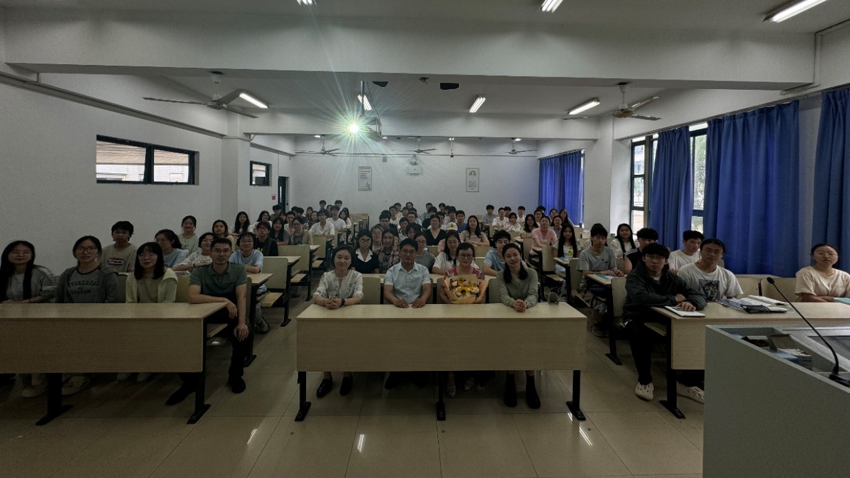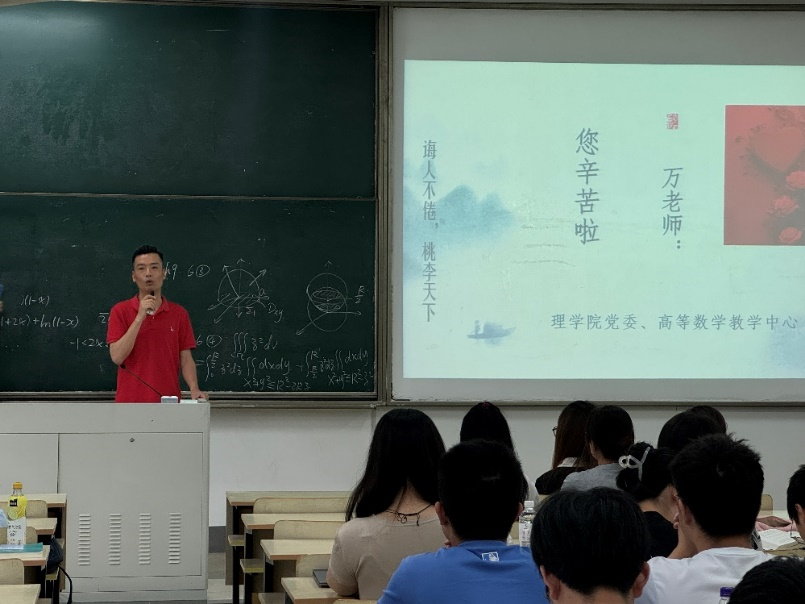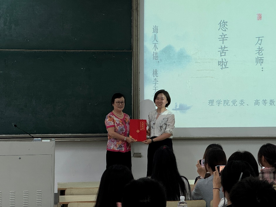 随着本学期《大学物理》最后一次课下课铃声响起,应用物理系教师代表翁亚奎手捧鲜花走进教室,为彭永刚老师献花并送上祝福,彭老师的荣休仪式由应用物理系主任王海云主持。