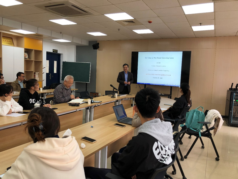 王金亭教授为大家带来了题为“On Value-at-Risk Based Queueing-Game”的学术报告。王教授以身边的排队现象为例深入浅出地讲述了排队理论的研究背景、研究内容及决策对排队系统的影响。由此引出排队博弈的概念,并介绍了排队博弈的研究现状及问题。接着,王教授分析了多种信息状态下具有风险偏好顾客的个体纳什均衡策略和社会最优策略,并研究相应的价格调控策略及其影响因素。最后,王教授给出了研究结论的相关管理建议和启示以及若干开问题。