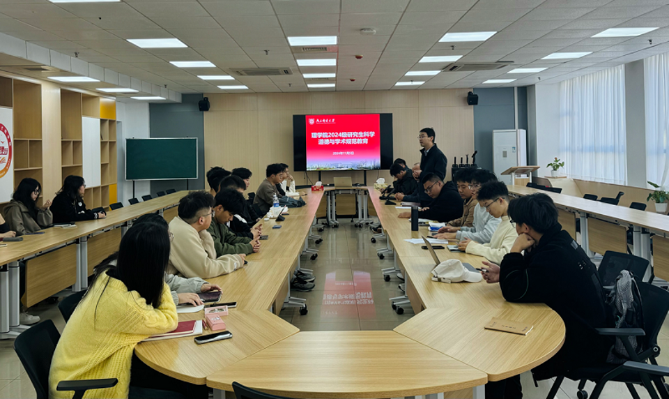 为教育研究生遵守科研工作规范、杜绝学术不端行为,形成优良学风,引导研究生掌握科学的研究方法,培养潜心科研、奋勇攀登的学术品质,帮助研究生尽快熟悉专业发展状况,科学规划学习生活。11月5日上午,太阳成集团tyc在教2-327邀请校一流学科和高水平大学建设办公室主任刘芫健教授来公司以科学道德与学术规范教育为主题对2024级研究生作专题讲座,本次讲座由太阳成集团tyc副经理王正新老师主持,太阳成集团tyc研究生辅导员胡国宝老师和2024级研究生参加了此次活动。