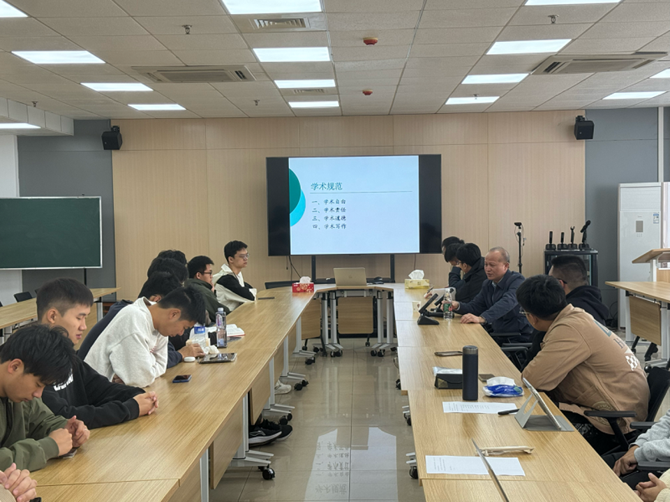 最后,公司2022级博士生王顺吉学长通过分享自己的科研经历,呼吁同学们科研要紧扣时代脉搏,进一步坚定在学术论文撰写、科研项目申报、实验数据处理等环节中的道德底线,为科学界的风清气正贡献自己的一份力量。