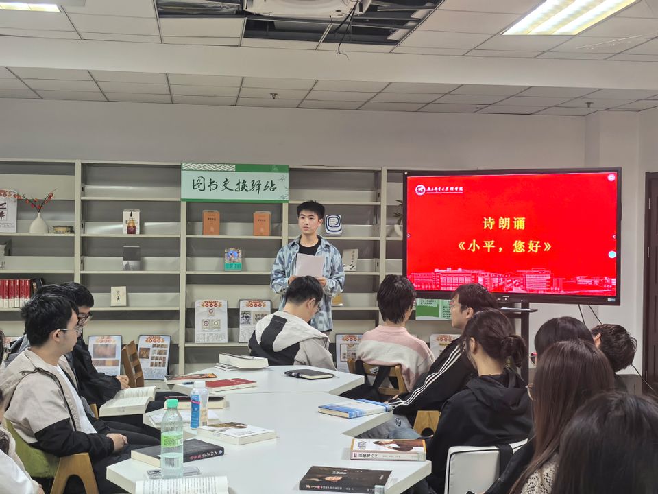 朗诵一首诗歌。党员代表陈鹏同学满含深情地诵读了诗歌《小平,您好》,饱满的情绪感染了在座的每一位同志,通过诗歌大家深刻感受到广大人民群众对邓小平同志的敬重与爱戴。