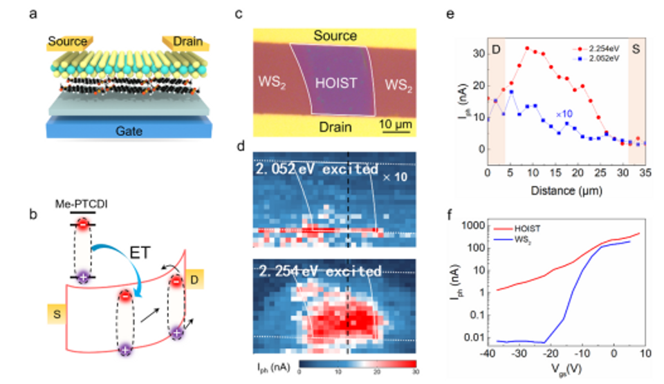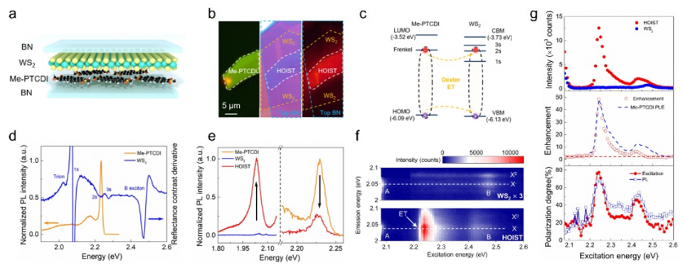 尽管二维半导体材料如过渡金属硫化物具有优异的光-物质相互作用和可设计的电子结构,但原子级厚度导致本征光吸收极低,严重限制其在光电器件中的应用。通过敏化层增强吸收的方法一般会严重限制器件响应速度。能量转移(ET)是以相干电子-空穴对形式进行的非辐射能量传递,然而,由于其常与超快电荷转移过程竞争,且受限于材料间能态匹配和波函数重叠等困难,在二维异质结构中实现纯ET一直面临极大挑战。