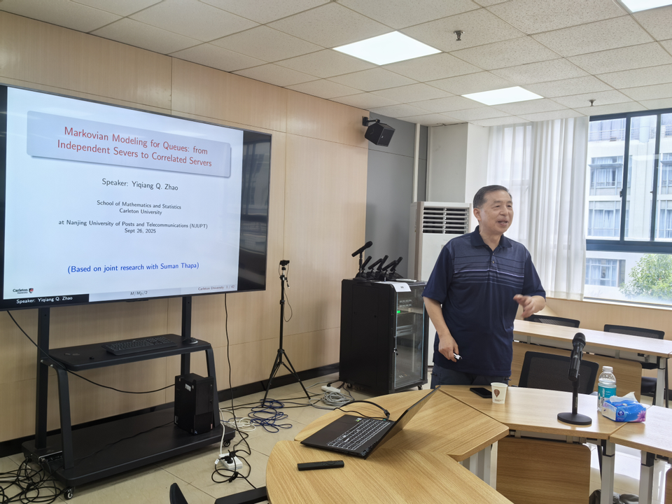 赵以强教授为大家带来了题为“Markovian Modeling for Queues: from Independent Severs to Correlated Servers”的学术报告。赵教授首先回顾了服务时间相依的串联排队模型的研究背景及研究现状,接着通过引入 Marshall-Olkin 双变量指数分布彻底解决了一类2服务员服务时间相依排队模型队长的稳态分布问题,并通过数值实验进一步说明了参数的改变对于稳态分布的影响。