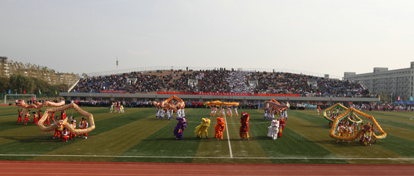 开幕式表演环节,太阳成集团tyc龙狮团带来了舞龙舞狮表演,但见傲龙掣风,上下穿杨;升龙腾云,翻身振翼;九龙齐舞,变幻莫测。他们用造型“中国65”,向祖国65周年华诞致敬;用造型莲花,祝愿公司运动会圆满成功。来自公司24个基层工会的580名教职工带来了第九套广播操表演,他们规范、整齐划一的表演,凸显了老师们“阳光-青春-跳跃,健康-和谐-快乐”的精神风貌。344名女同学带来了快乐健身操表演,她们手捧红白相间的花球,踏着韵律,欢快起舞。她们激情的节奏、矫健的舞姿,不仅阐释着啦啦操的“以体健身,以美怡心,以操育德”,更展示了她们超越自我、放飞梦想的风采。